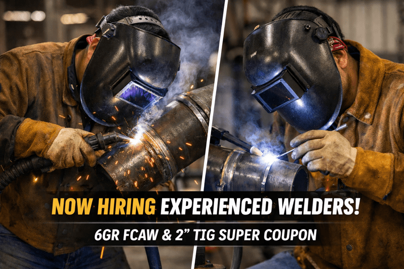 $32/hr welding opportunity for top-tier welders. Pass a 6GR FCAW test + 2” TIG Super Coupon and get placed on high-level industrial projects.